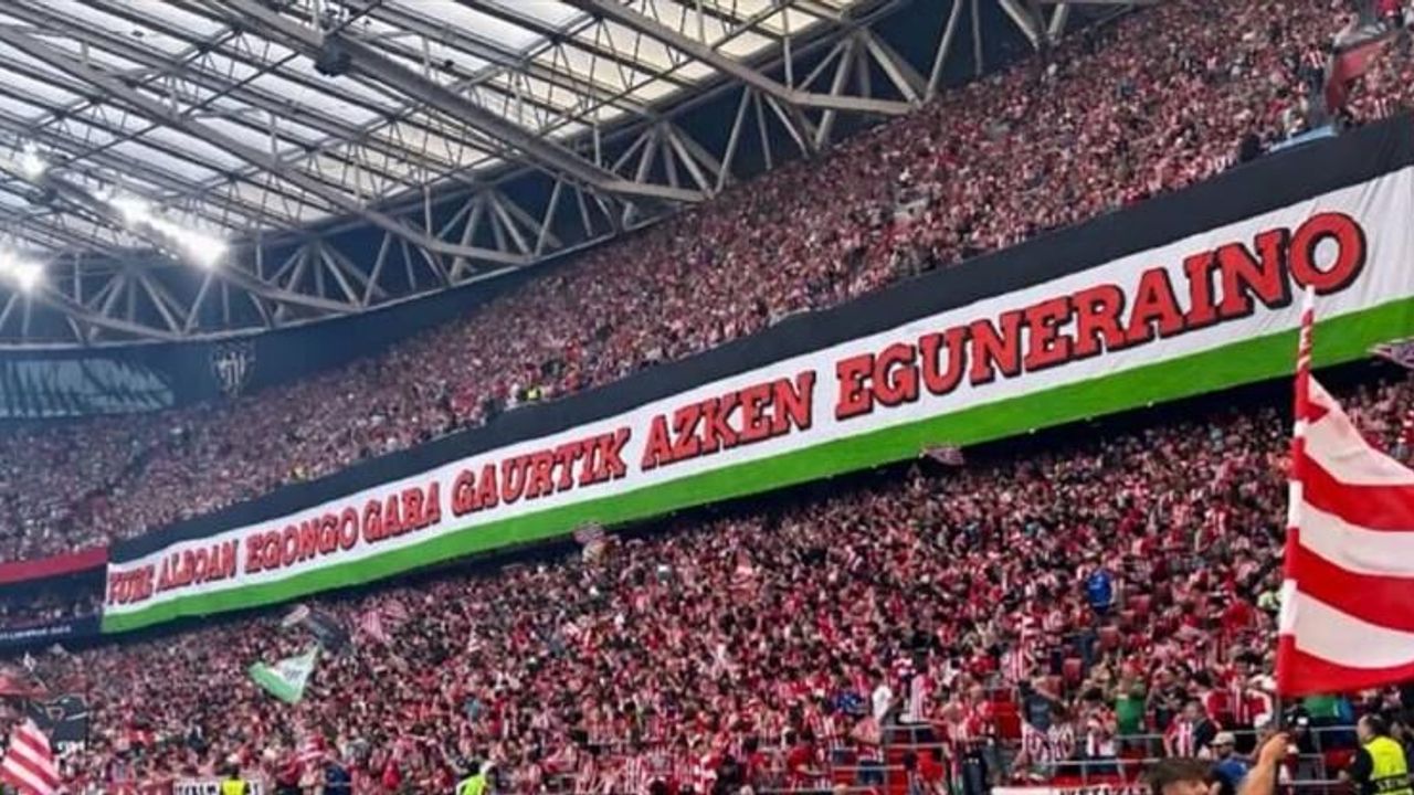 Estadio de San Mames Stadı'nda oynanan karşılaşmada İsrail'in işgali altındaki Filistin'e destek veren kırmızı-beyazlı takımın taraftarları, "Bugünden son güne kadar yanınızda olacağız" yazılı pankarta yer verdi.