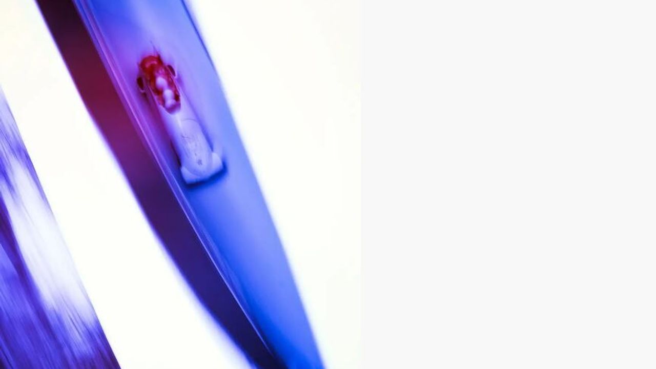 Beyaz boşlukla çevrilen mavi ve mor tonlar, minimal renk paleti içinde hız duygusunu estetik bir anlatıya dönüştürüyor.
