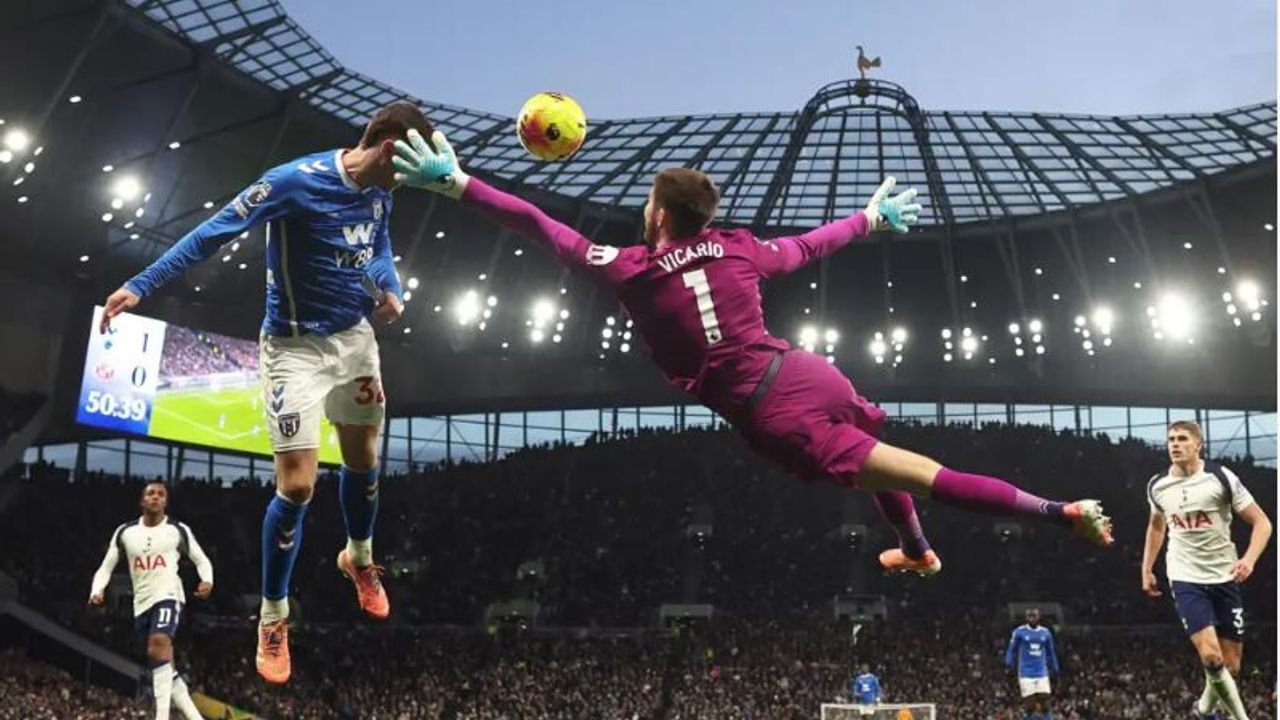Sunderland'dan Trai Hume'un kafa vuruşunu Tottenham kalecisi Guglielmo Vicario uzaklaştırmaya çalışıyor.