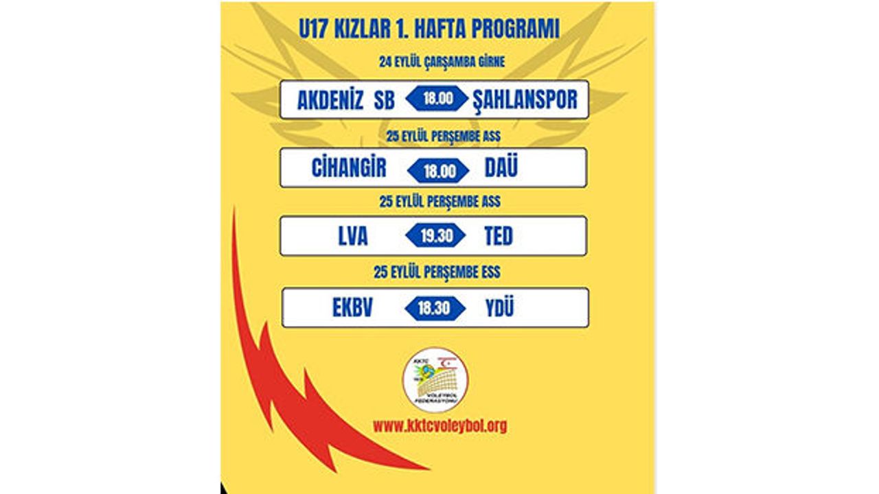 Voleybolda yeni sezon 24 Eylül Çarşamba saat 18.00’de U17 Kızlar Liginde A Grubundaki Akdeniz Spor Birliği – Şahlanspor arasındaki müsabaka ile başlayacak. 25 Eylül Perşembe akşamı U17 Kızlar A ve B Grubu karşılaşmaları oynanacak.